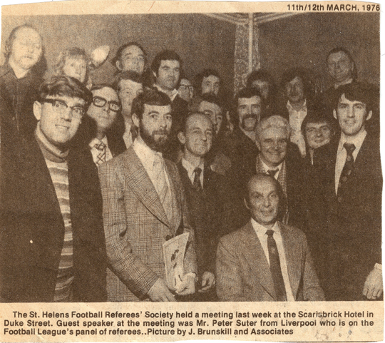 St Helens Referees' Society featuring (from left to right) Brian Foy, Brain Railton, Geoff Kettle, Ken Dixon, George Chapman, Les Richards, Steve Forster, Bob Pickering, David Watkins, Steve Buckley, John Cowley, Dave Nolan, Billy Lever, Phil Wakins, Harry Cross, Peter Kilgannon, Barry Kilgallon, Peter Alcock, Tommy Cannon, Peter Fenney, Barry ???, Jock Craig, Mal Mason, Alan Jones, Arthur Mimmack, Len Kelly, Phil Parr.