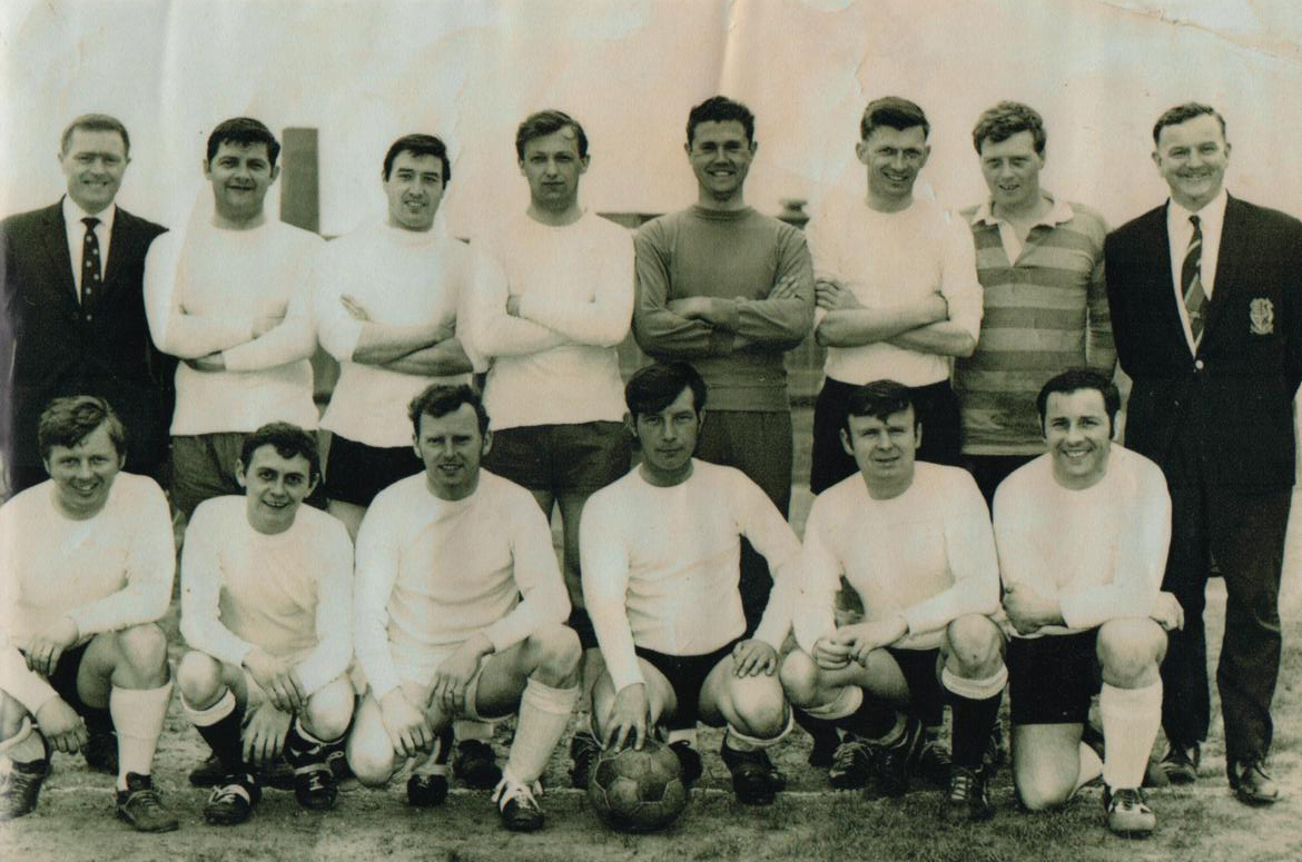 Liverpool Referee Society Football Team - John Livingston (GK), Derek Cleveland (centre back row), Terry Roscoe (far right), Len Kelly & Arthur Turner (front row centre).